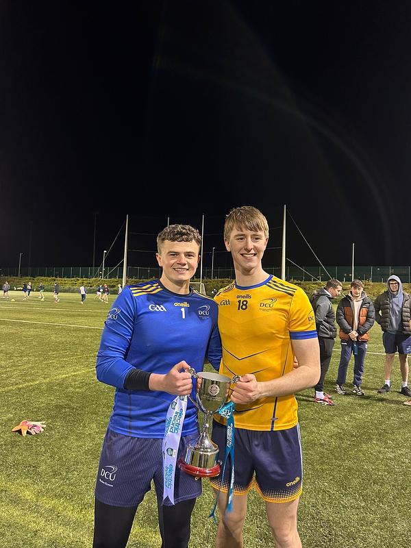 Congrats to DCU who won the Intermediate colleges title tonight with a 2-15 to 2-13 victory over University of Ulster Jordanstown. Congrats to our two lads who featured. Cian was magnificent, kicking two great two pointers and then a crucial penalty save in the second half. He deservedly received the Man of the Match award. Brian came on as a blood sub for the last ten minutes of the first half and then for the last ten minutes of the second half.